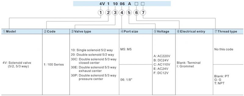 در جدول زیر می توانید به مشخصات کلی شیر دسترسی پیدا کنید به عنوان مثال آیتم یک (۴V) نشان دهنده مدل شیر برقی می باشد. آیتم ۲ نشان دهنده نوع شیر برقی می باشد به عنوان مثال ۲ نشان دهنده بدنه شیر برقی سایز ۱/۴ می باشد ۳ نشان دهنده بدنه شیر برقی ها شیر برقی های سایز ۳/۸ می باشد و ۴ نشان دهنده بدنه شیر برقی ها سایز ۱/۲ می باشد.